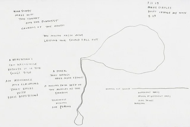 Music from Christopher, Don’t Change Me Now, 2019. Cochlear implant, YouTube playlist, graphite, and paper, 11 × 17 inches.